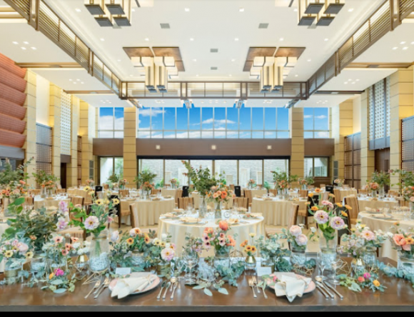 披露宴会場は、人数やテーマに合わせて選べる空間をご用意しています。 モダンで洗練されたインテリアと、柔らかな光が差し込む開放的なデザインが特徴です。